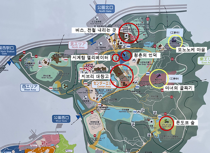 현재 조성되어 있는 '지브리의 대창고', '청춘의 언덕', '돈도코 숲' 외에 조성 예정인'모노노케 마을'과 '마녀의 골짜기' 위치가 표시되어 있네요.