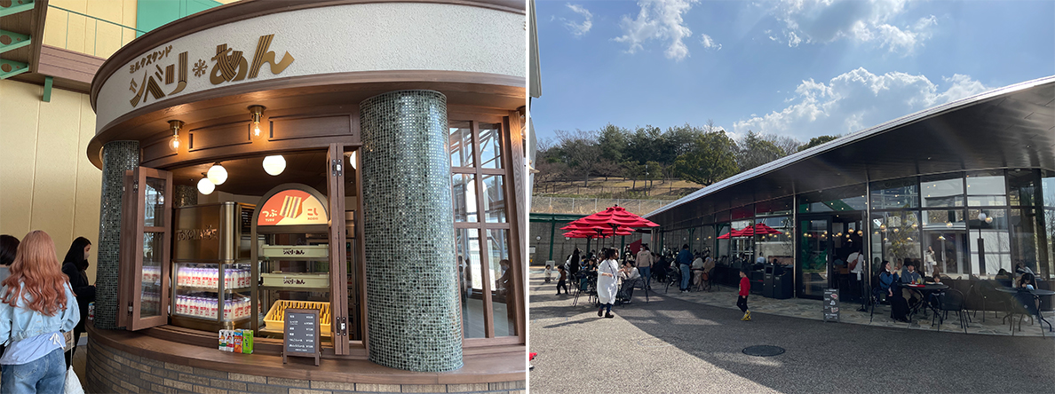 굿즈샵 옆에 위치한 간식 부스에서는 지브리 애니메이션 '바람이 분다'에 나왔던 단팥 카스테라와 병우유를 판매하고 있습니다. 팥은 알갱이가 씹히는 버전과 곱게 갈린 버전 둘 중 고를 수 있으며, 맛은 평범합니다.