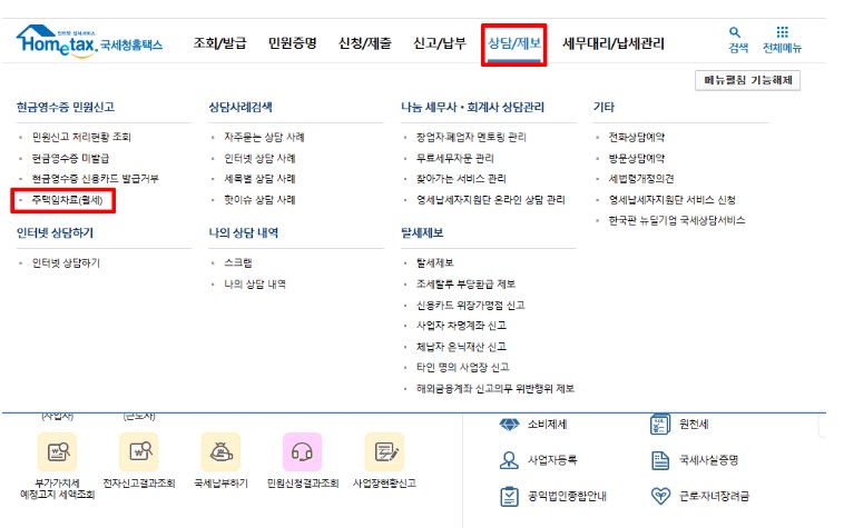 위 서류들을 준비, 홈택스>상담/제보>주택임차료(월세)에서 현금영수증 발급을 신청할 수 있습니다.