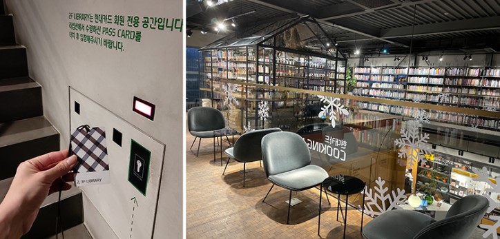 쿠킹 라이브러리는 현대카드 회원 본인 및 동반 2인까지 입장 가능합니다. 입장하자마자 보이는 리셉션에서 카드를 제시하면 2층 라이브러리에 입장할 수 있는 카드키를 수령할 수 있습니다.